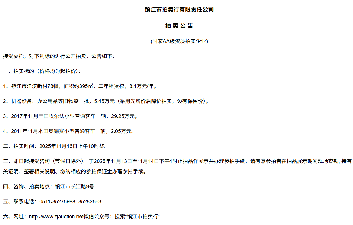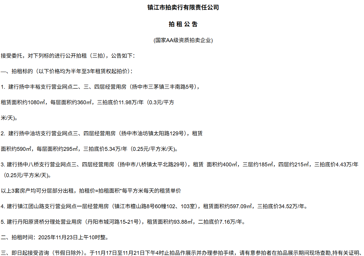 鎮(zhèn)江市拍賣行有限責(zé)任公司拍 租 公 吿(國家AA級資質(zhì)拍賣企業(yè))接受委托,對下列標(biāo)的進(jìn)行公開拍租(三拍),公告如下:—、拍租標(biāo)的(以下價(jià)格均為半年至3年租賃權(quán)起拍價(jià)):1.  建行揚(yáng)中豐裕支行營業(yè)網(wǎng)點(diǎn)二、三、四層經(jīng)營用房(揚(yáng)中市三茅鎮(zhèn)三豐南路5號),租賃面積約1080㎡,每層面積約360㎡,三拍底價(jià)11.98萬/年(0.3元/平方米/天)。2.  建行揚(yáng)中油坊支行營業(yè)網(wǎng)點(diǎn)三、四層經(jīng)營用房(揚(yáng)中市油坊鎮(zhèn)太陽路129號),租賃面積約590㎡,每層面積約295㎡,三拍底價(jià)5.34萬/年(0.25元/平方米/天)。3. 建行揚(yáng)中八橋支行營業(yè)網(wǎng)點(diǎn)三、四層經(jīng)營用房(揚(yáng)中市八橋鎮(zhèn)太平北路29號),租賃  面積約400㎡,三層約185㎡,四層約215㎡,三拍底價(jià)4.43萬/年(0.25元/平方米/天)。以上3套房產(chǎn)均可分層部分出租,拍租價(jià)=拍租面積*每平方米每天的租賃單價(jià)4. 建行鎮(zhèn)江團(tuán)山路支行營業(yè)網(wǎng)點(diǎn)一層經(jīng)營用房(鎮(zhèn)江市檀山路8號60幢102、103室),租賃面積約597.09㎡,三拍底價(jià)34.52萬/年。5. 建行丹陽原賢橋分理處營業(yè)用房(丹陽市城河路15-21號),租賃面積約93.88㎡,二拍底價(jià)7.16萬/年。二、拍租時(shí)間:2025年11月23日上午10時(shí)整。三、即日起接受咨詢(節(jié)假日除外)。于11月17日至11月21日下午4時(shí)止拍品作展示并辦理參拍手續(xù),請有意參拍者在拍品展示期間現(xiàn)場查勘,持有關(guān)證明、簽署相關(guān)說明、繳納相應(yīng)的參拍保證金辦理參拍手續(xù)。四、咨詢、拍租地點(diǎn):鎮(zhèn)江市長江路9號五、聯(lián)系方式:0511-85275988   13655299933楊先生六、網(wǎng)址:http://www_zjauction_net.thestutors.com;微信公眾號:搜索“鎮(zhèn)江市拍賣行” 拍品清單2025.11.23序號名稱起拍價(jià)(元)標(biāo)的說明1建行揚(yáng)中豐裕支行營業(yè)網(wǎng)點(diǎn)二、三、四層經(jīng)營用房(揚(yáng)中市三茅鎮(zhèn)三豐南路5號),租賃面積約1080㎡,每層面積約360㎡三拍底價(jià)11.98萬/年(0.3元/平方米/天)1、1-3號房產(chǎn)均可分層部分出租,拍租價(jià)=拍租面積*每平方米每天的租賃單價(jià);2、意向競拍人在拍賣前需持營業(yè)執(zhí)照或身份證與委托方說明租賃房產(chǎn)經(jīng)營業(yè)態(tài),確定意向后出具房產(chǎn)承租用途承諾書,經(jīng)委托方審核后,方可交納保證金參加競拍;3、租賃期限為半年至3年(承租方與出租方協(xié)商而定),承租方每半年或一年結(jié)付租金,租賃期間的水、電費(fèi)用及其它相關(guān)費(fèi)用均由承租方承擔(dān);4、承租方不得用于經(jīng)營和保管危險(xiǎn)物品,不得用于開設(shè)餐飲、娛樂等可能嚴(yán)重影響消防安全、運(yùn)營安全的經(jīng)營業(yè)態(tài),不得用于經(jīng)營委托貸款、小額貸款等可能冒用委托方名義,帶來聲譽(yù)風(fēng)險(xiǎn)的經(jīng)營業(yè)態(tài)。租賃期內(nèi),承租方不得破壞墻體結(jié)構(gòu),自行成就消防、安全等使用條件,不得擅自將租賃房屋轉(zhuǎn)租、轉(zhuǎn)讓給他人使用,否則委托方有權(quán)收回房屋;5、拍租成交后,承租方將租金交至出租方指定賬戶,傭金交至拍賣方賬戶(拍租傭金為該房屋一個(gè)月租金)。承租方憑租賃合同無息退還保證金。2建行揚(yáng)中油坊支行營業(yè)網(wǎng)點(diǎn)三、四層經(jīng)營用房(揚(yáng)中市油坊鎮(zhèn)太陽路129號),租賃面積約590㎡,每層面積約295㎡三拍底價(jià)5.34萬/年(0.25元/平方米/天)3建行揚(yáng)中八橋支行營業(yè)網(wǎng)點(diǎn)三、四層經(jīng)營用房(揚(yáng)中市八橋鎮(zhèn)太平北路29號),租賃面積約490㎡,每層面積約245㎡三拍底價(jià)4.43萬/年(0.25元/平方米/天)4建行鎮(zhèn)江團(tuán)山路支行營業(yè)網(wǎng)點(diǎn)一層經(jīng)營用房(鎮(zhèn)江市檀山路8號60幢102、103室),建筑面積約597.09㎡三拍底價(jià)34.52萬/年5建行丹陽原賢橋分理處營業(yè)用房(丹陽市城河路15-21號),建筑面積約93.88㎡二拍底價(jià)7.16萬/年