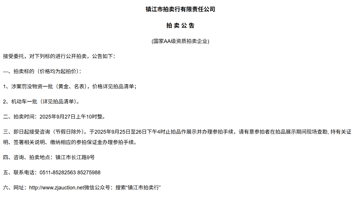 本公司受鎮(zhèn)江市公安局委托,對2025年度鎮(zhèn)江市市區(qū)摩托車上牌額度認(rèn)購權(quán)進(jìn)行拍賣,現(xiàn)將有關(guān)事項(xiàng)公告如下: